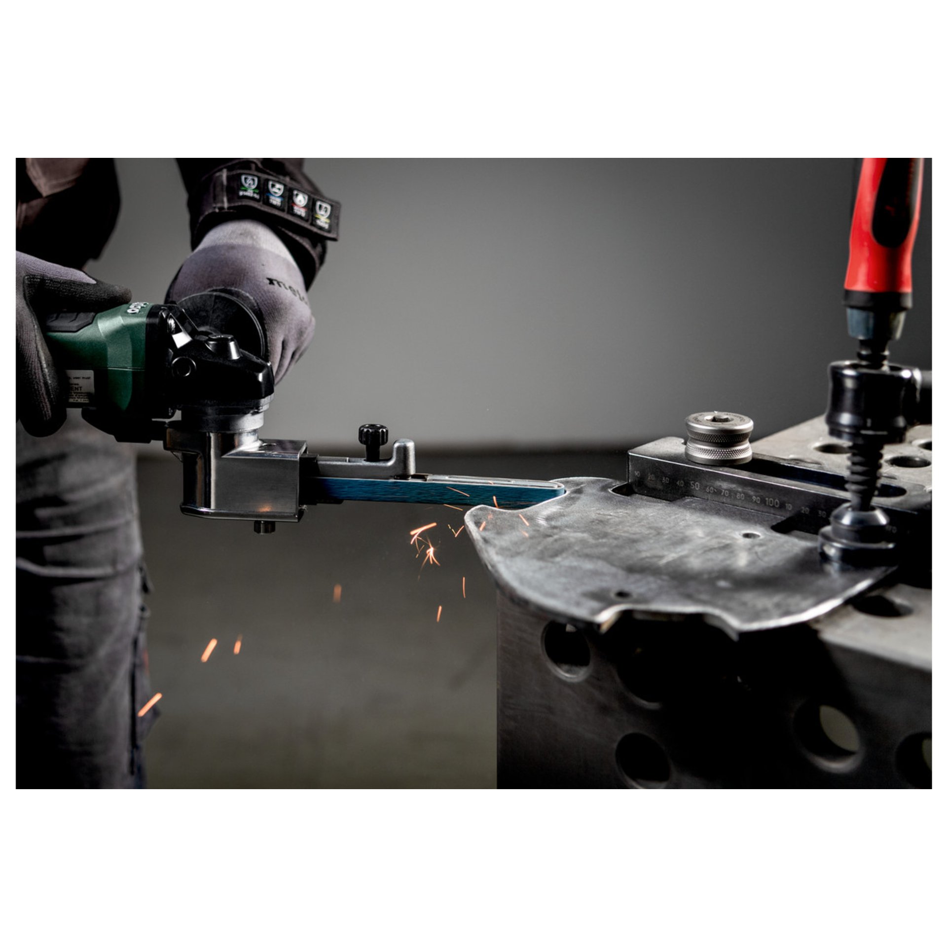 Leistungsstarke, kompakte Akku-Bandfeile mit Brushless-Motor zum Schleifen, Satinieren und Entgraten von Metall an schwer zugänglichen Stellen