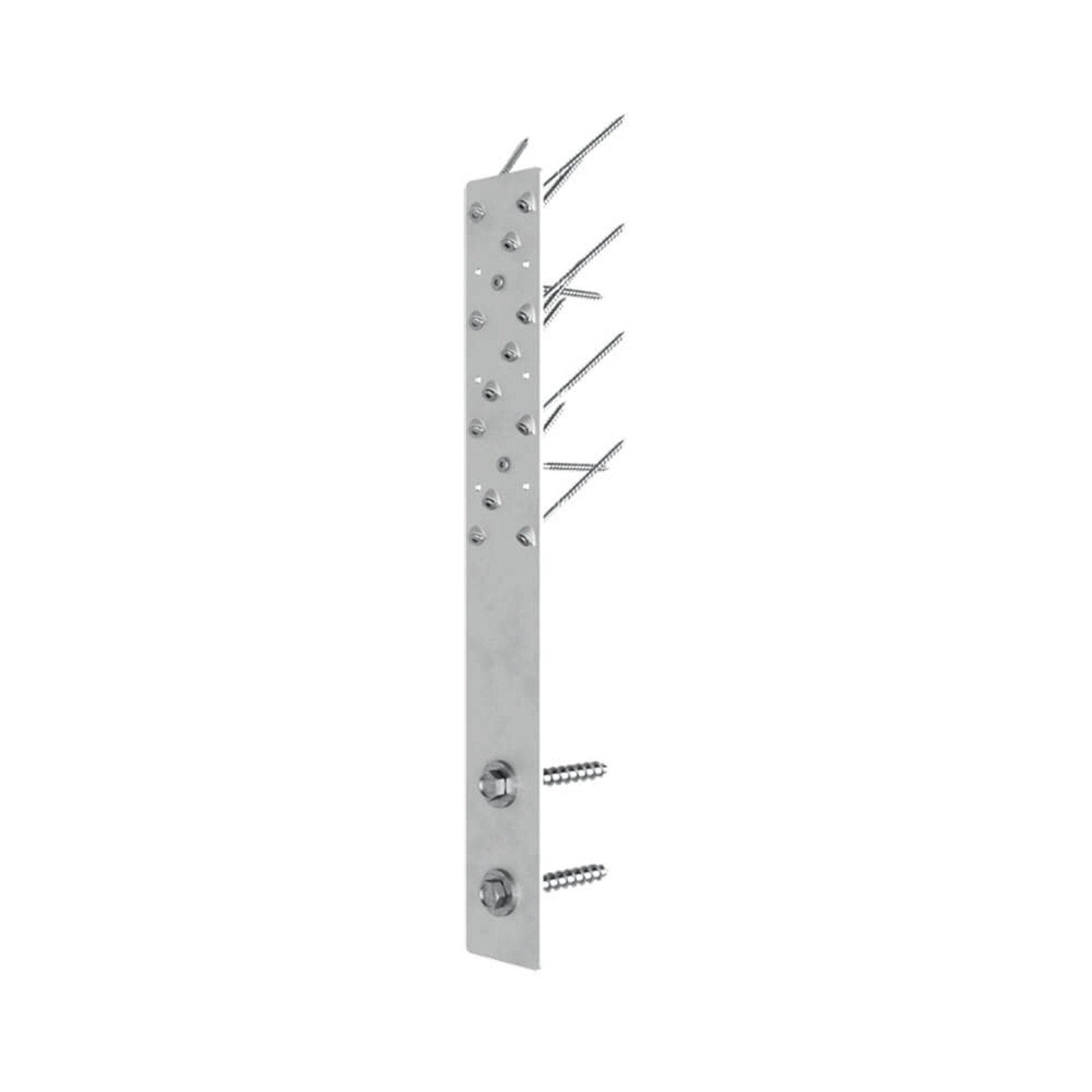 In einem Winkel von 45° wird die Zuglasche mithilfe von Senkkopfschrauben 5 x 120 mm befestigt. Durch die vorgesehene Schraubenführung entsteht eine kraftschlüssige Verbindung zwischen Zuglasche und Schraubenkopf. Für die 90° Fixierung der HH70 sind zwei weitere Löcher Ø 5 mm vorhanden. Mit der Rock-Betonschraube oder dem Bolzenanker kann die Zuglasche mit Hilfe der Löcher Ø 14 mm in Beton verschraubt werden.