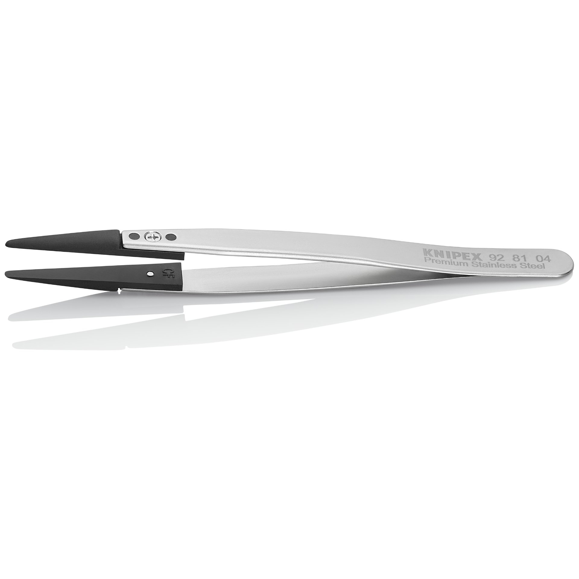 92 81 04 Pinzette mit Wechselspitzen ESD Für besonders anspruchsvolle Feinarbeiten: mit hoher Korrosionsbeständigkeit und Zähigkeit. Maximal oberflächenschonend für die Handhabung empfindlicher elektronischer Komponenten, mikro-mechanischer Teile sowie von Glas- und Keramikbauteilen. Für Elektronik- und Feinmechanikindustrie, Uhrenhersteller, Juweliere. In Handarbeit gefertigte Grundkörper: mit polierten Kanten und hervorragend mattierter, kratz- und spiegelfreier Oberfläche. Grundkörper aus hochwertigem Premium-Edelstahl: hohe Temperaturbeständigkeit und exzellente Korrosionsbeständigkeit gegenüber den meisten Chemikalien, Salzen und Säuren. Die Wechselspitzen bestehen aus 30% kohlenstofffaserverstärktem Kunststoff: elektrisch und thermisch sehr gut leitfähig, kratzsicher und mit hohem Abriebwiderstand. Die austauschbaren, kohlenstofffaserverstärkten Kunststoffspitzen haben einen Oberflächenwiderstand zwischen 10^2 und 10^4 Ohm zum kontrollierten Ausgleich von Potenzialunterschieden zwischen Bediener und elektronischen Bauteilen. Die Wechselspitzen sind dauerhaft temperaturstabil bis 130 °C, kurzfristig bis zu 190 °C. Die kohlenstofffaserverstärkten Kunststoffspitzen sind vollelastisch, ermüdungsbeständig, vibrationsdämpfend sowie wasserabweisend. Gute chemische Beständigkeit der Spitzen gegenüber den meisten Ölen, Fetten, Kraftstoffen und unpolaren Lösungsmitteln. Mit der Genauigkeit und Stabilität einer regulären Pinzette: Die Kunststoffspitzen haben eine spielfreie 3-Punkte-Verbindung (2 Fixierungen an den Stegen, eine Schraube), die dem Benutzer eine perfekte und spielfreie Befestigung am Grundkörper garantieren. Mit Sparpotential: Das Spitzensortiment umfasst eine Auswahl an unterschiedlichsten Formen. Je nach Anwendung müssen lediglich Spitzen nachgekauft werden. - Oberfläche: Mattiert - Ausführung: Gerade - Spitzenbreite (A): 1mm - Spitzenbreite (B): 2mm - Ausführung Pinzettenspitze: Stumpf - Korrosionsbeständig: ja   - Säurebeständigkeit: Sehr gut - ESD-geprüft: ja   - VDE-geprüft: nein   - Branchen: Industrie Elektronik Uhrenhersteller Juwelier - Magnetisch: Nicht magnetisierbar (80%) - Verhalten: ableitend
